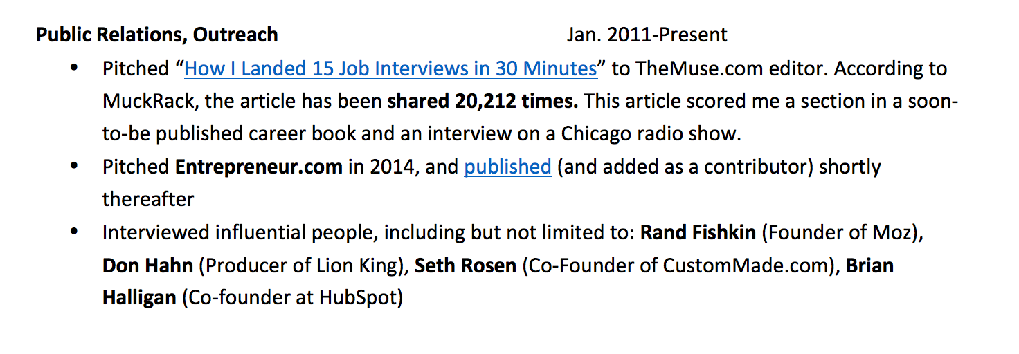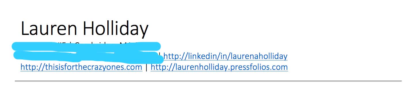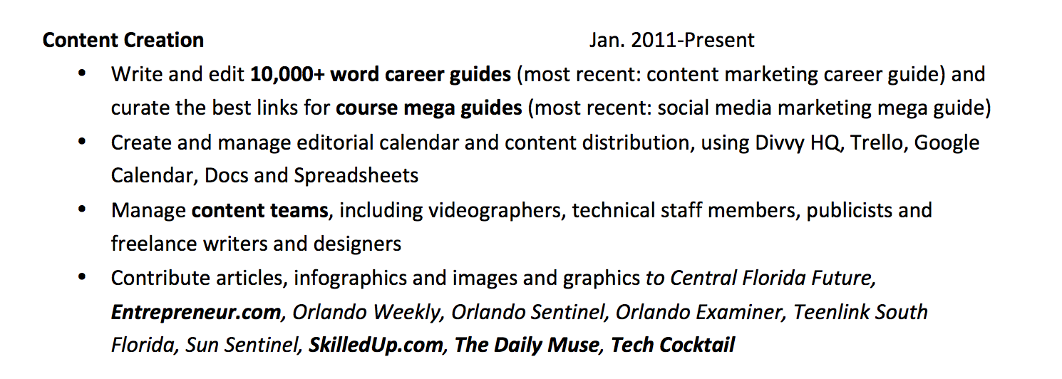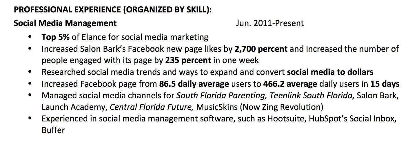 Since GeekHive consistently mentions that they want someone with “social media,” “content creation” and “brand management” experience, I would choose those three skills to focus on in my one-page resume or, what I prefer to call a “one-pager” on me.